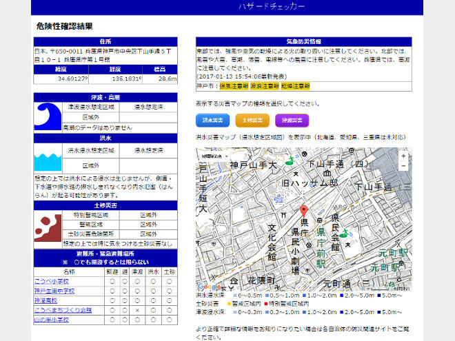 兵庫県立大大学院応用情報科学研究科の研究チームが開発した防災のWebアプリ。住所や目印になる建物名を入力すると、南海トラフ巨大地震で想定される津波高や、数十年に1度の大雨による洪水で想定される浸水の深さが確認できる。近くにある避難所やリアルタイムの気象情報も知ることができる。