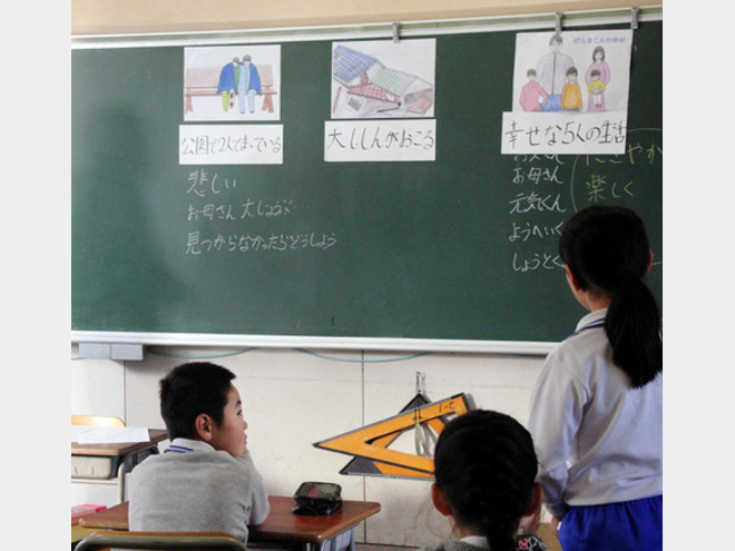 小学2年生のときに阪神・淡路大震災で母親と弟を亡くした小学校教師、長谷川元気さんの経験を題材にした紙芝居「元気くんのゆめ」。長谷川さんが所属する震災の語り部グループで神戸学院大の舩木伸江准教授も活動している縁で、同大の学生たちが長谷川さんにインタビューを重ねて作った。母と弟が亡くなったと分かった時、学校の担任に励まされて教師を目指したことなど、それぞれの場面を絵で示し、児童にどう感じるかを問い掛ける。紙芝居は長谷川さんの体験を、子どもたちが自分のことのように考えるきっかけになる。