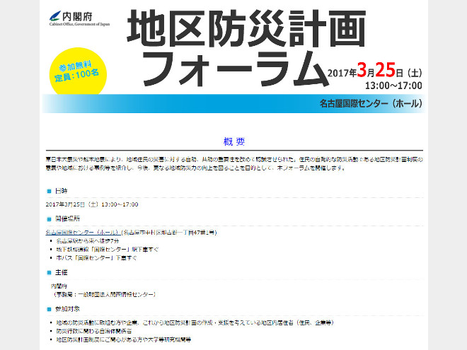 内閣府主催で、3月25日(土)に愛知県名古屋市の名古屋国際センター(ホール)にて開催。住民の自発的な防災活動である地区防災計画制度の意義や地域における事例等を紹介し、今後、更なる地域防災力の向上を図ることが目的。当日は、今年度の活動・活動マネジメント・今後の展望の3部に分かれ、各基調講演のほか、今年度モデル事業の報告や、パネルディスカッションが行われる。