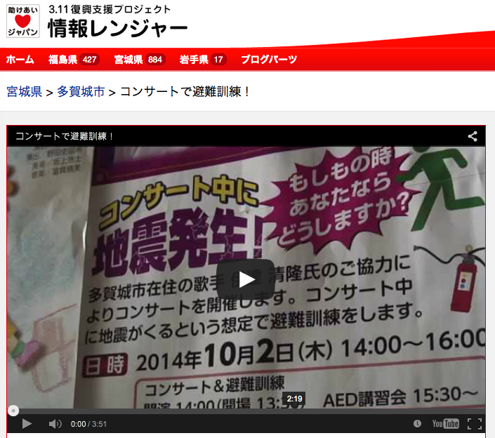 「もし、コンサート開催中に災害が起きたら」宮城県多賀城市では、リアルな状況での避難訓練を行うため、実際にホールを利用してコンサートを開催し、その最中に自身が起きたという想定で避難誘導の訓練をするイベントを開催しています。地元在住の歌手の協力のもと、実際にいる利用者を誘導するこの訓練の背景や趣旨について、助けあいジャパンの情報レンジャーが取材しています。