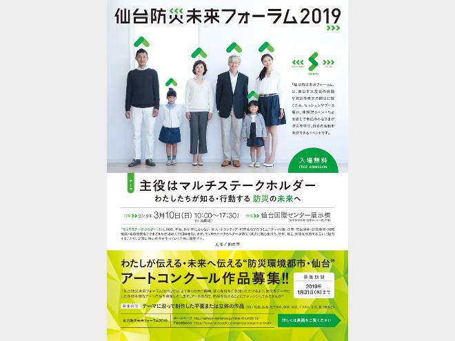 宮城県仙台市が来年3月10日、東日本大震災の伝承と防災啓発の在り方を市民と共に考える「仙台防災未来フォーラム2019」を仙台国際センターで開催する。市はアート作品の出品や、防災や復興に携わる企業・団体の出展、プレゼンテーションを募っている。初めての開催となるアートコンクールは小学生以下、中高生、一般の3部門を設定。テーマに沿った各種作品を募集する。応募締め切りは来年1月31日。出品無料。