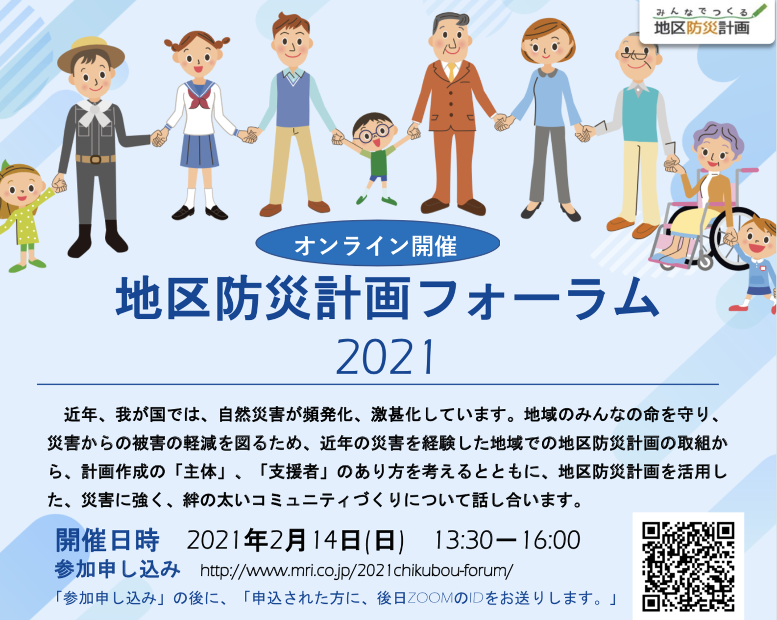 内閣府防災では、令和3年2月14日(日)に、熊本地震や7月豪雨の被災地からの地区防災計画の取組をもとに計画作成の「主体」と「支援者」のあり方や、地区防災計画を活かした災害に強いコミュニティづくりについて話し合う「地区防災計画フォーラム2021」をオンライン開催する。