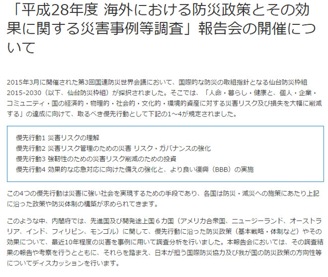 内閣府の主催で3月28日(火)に東京都千代田区の都道府県会館にて開催。報告会では、内閣府が先進国及び開発途上国6カ国(アメリカ合衆国、ニュージーランド、オーストラリア、インド、フィリピン、モンゴル)に関して、優先行動に沿った防災政策(基本戦略・体制など)やその効果について、最近10年程度の災害を事例に用いて調査分析を行った結果の報告や考察を行うとともに、それらを踏まえ、日本が担う国際防災協力及び我が国の防災政策の方向性等についてディスカッションする。