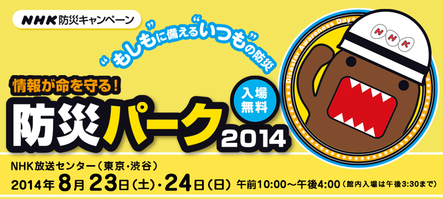 「防災パーク2014」は、「“もしも”に備える“いつも”の防災」をテーマに開催します。首都直下地震や風水害など、首都圏で起こりうる災害 に対して、日常生活の中でどのように備えればよいかを、子どもから大人まで一緒に「知る」「学ぶ」「体験」することができるイベントが盛りだくさんです。