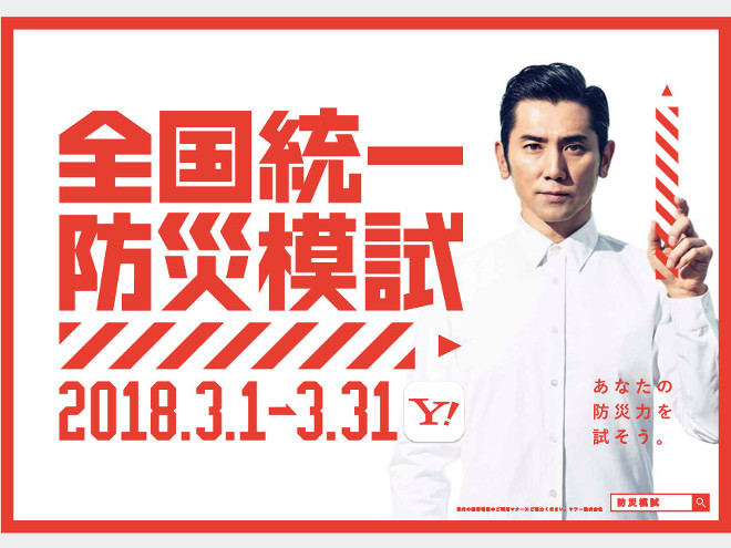 ヤフー株式会社がスマートフォン用アプリ「Yahoo! JAPAN」内にて、3月1日~31日までの期間限定で実施している、防災に必要な知識や能力を問う試験。東北大学災害科学国際研究所 佐藤翔輔 准教授監修のもと、「発災」「避難」「避難所」「生活再建」のフェーズに合わせた全25問の設問から構成されている。期間終了後(4月1日以降)には、A4サイズ1枚にまとまった設問と解答の一覧を、Yahoo! JAPAN特設サイトからダウンロードができる予定で、印刷して職場や家族で共有するなど、模試の内容を復習することができる。