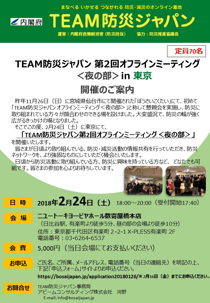 「TEAM防災ジャパン第2回オフラインミーティング<夜の部>in東京」(2月24日(土))開催のお知らせ