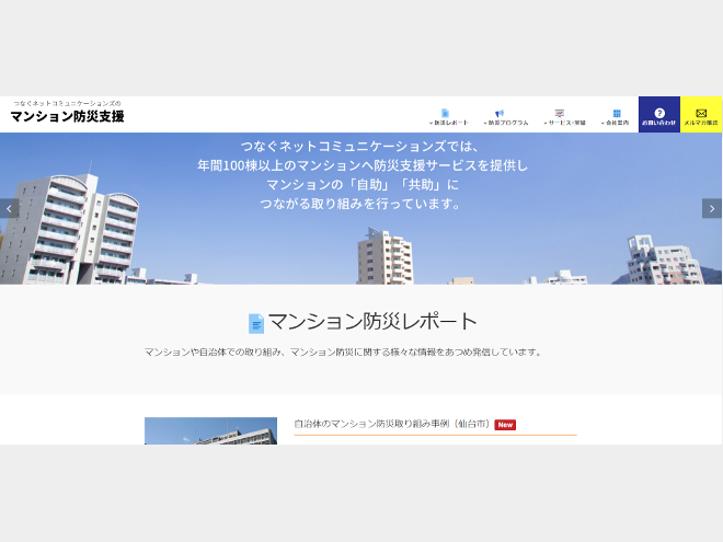 マンションや自治体での取り組み、マンション防災に関する様々な情報をあつめ発信。自助と共助の具体策を段階的に充実できるよう考案した「『マンション内被災生活』実現支援プログラム」に沿って、さまざまな防災対策を提供している。