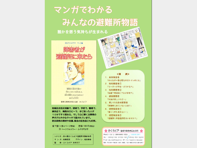 愛知県豊橋市障害者(児)団体連合協議会が指定管理者を務める市障害者福祉会館「さくらピア」で3年前に行った「避難所体験」で、障害当事者やボランティア、行政関係者、近隣住民ら参加者が制作した防災ラジオドラマのシナリオをマンガに描き起こしたもの。シナリオは、豊橋で震度6の地震が起きてライフラインが止まった想定で、避難所に各種障害のある人を含む地域住民が集まる場面を通して、起こり得る問題点や心の持ちようを描いている。