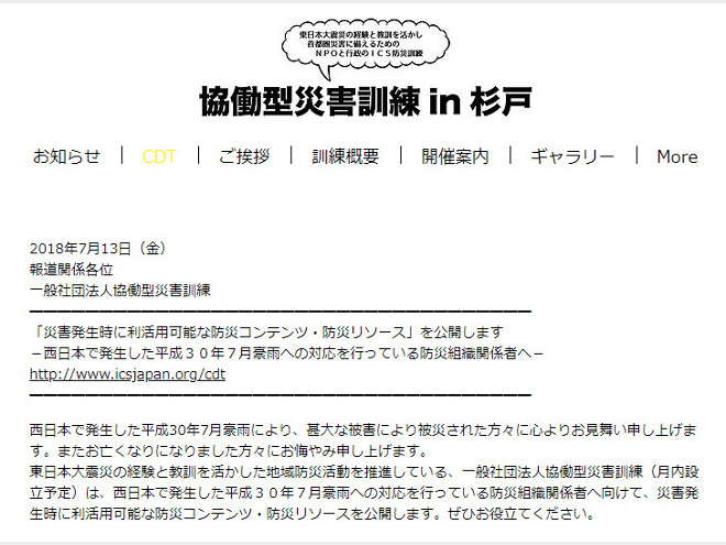 一般社団法人協働型災害訓練が、平成30年7月豪雨への対応を行っている防災組織関係者へ向けて、災害発生時に利活用可能な防災コンテンツ・防災リソースを公開している。避難所や自宅避難者の医療情報の把握と共有に役立つ医療に特化したソーシャル医療連携プラットフォームや、地域情報共有・収集ツールとして活用し、地図情報として公開することが可能なeコミマップなどを紹介している。