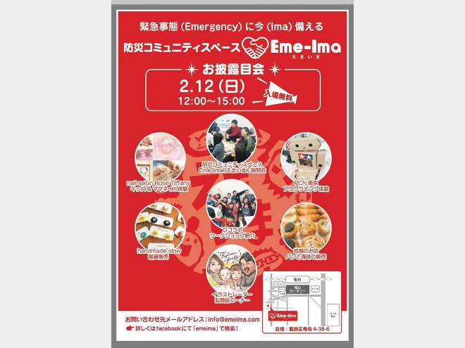 東京都葛飾区亀有に2月12日、防災コミュニティースペース「Eme-Ima(えまいま)」がオープンした。「Emergencyに今(Ima)備える」という意味から「Eme-Ima」と名付けられた。地域の人が集まって防災の話し合いをするだけではなく、地域の職能を持つ人による教室やワークショップの開講、イベントの開催を行うことにより、自然な形で人のつながりを築くことを目的に運用する。