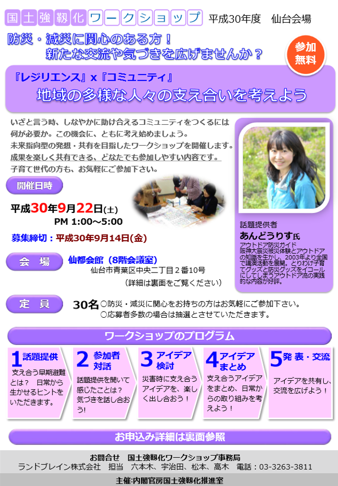 9月22日(土)に、仙台市の仙都会館にて、国土強靱化ワークショップが開催される。
