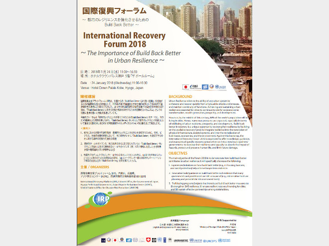 国際復興支援プラットフォーム(IRP)が、2018年1月24日(水)に兵庫県神戸市にて「国際復興フォーラム2018」を開催する。今回のフォーラムでは、「都市のレジリエンスを強化させるための Build BackBetter」をテーマに、都市における災害復興の経験や実践、政府等公的機関によるガイダンスや先駆的プログラムを共有し、「Build Back Better」がいかにして都市のレジリエンス強化において重要な役割を果たし得るのかの討議を通して、どのような復興活動によって、都市が自然災害の衝撃を緩和し、人命を守り、公的・私的財産の損害や崩壊を抑制することが出来るのかを明らかにして、「Build BackBetter」へ向けた成果として世界へ発信する。