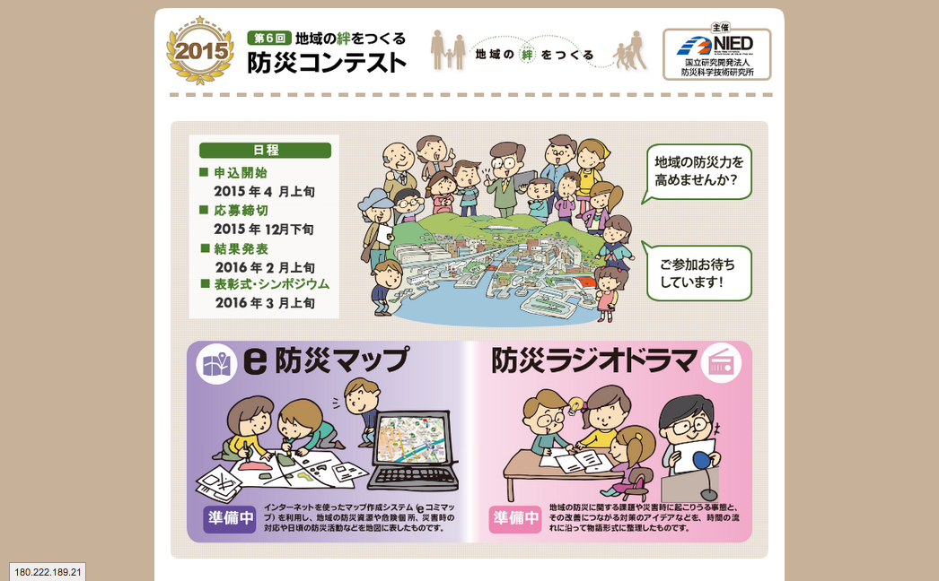 地域の防災力を、防災活動を共に取り組む仲間や災害時に協力し合う仲間と絆をつくりながら高めて発表するコンテストが行われている。グループで地域の過去の災害や危険箇所、災害時の対応などを調べ、インターネット上の地図にまとめる「e防災マップ」や、物語形式に整理した「防災ラジオドラマ」として応募することができる。今回6回目を迎え、毎年応募するグループもいるという。