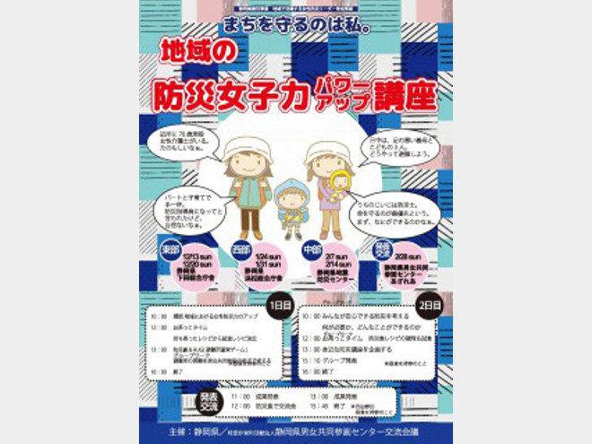静岡県の地域で活躍する女性防災リーダー育成事業。地域における女性防災力をアップするための2日間の講座。12月~2月まで東・中・西部の各地で行われ、2月28日(日)に静岡市で発表交流会を開催する。聴講は男性も可能。