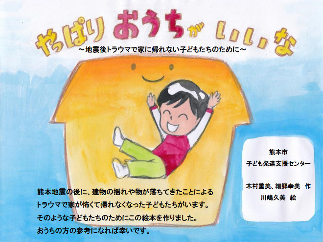 熊本市こども発達支援センターが、発達障害の子どもを持つ親から「子どもが地震を怖がって家に入れないため車中泊を続けている」といった相談が寄せられたことを受けて、同じ悩みを抱える子どもや保護者向けに制作した絵本。家に入れない男の子が主人公で、親が落ちてきそうなものを片づけ地震が起きたらテーブルの下に隠れるよう教えると男の子は家に入れるようになったというストーリー。熊本市こども発達支援センターのホームページからダウンロードすることができる。
