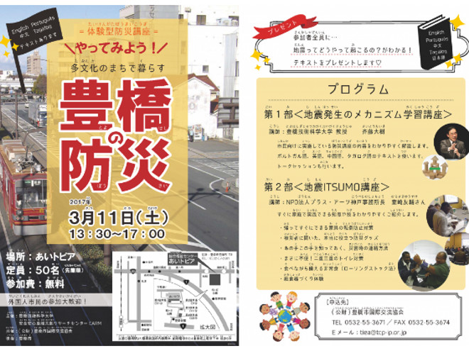 豊橋技術科学大学 安全安心地域共創リサーチセンターが、3月11日(土)に愛知県豊橋市のあいトピアにて外国人向け体験型防災講座を開催する。「地震発生のメカニズム学習講座」では、市民向けに実施している防災講座の内容をポルトガル語、英語、中国語、タガログ語のテキストを使ってわかりやすく解説。「地震ITSUMO講座」ではすぐに家庭で実践できる知恵や技をわかりやすく紹介する。