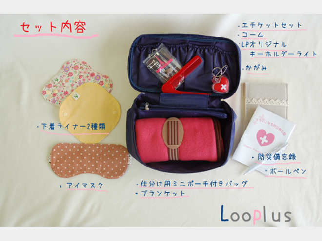 岩手県内陸部にある紫波町で暮らす4人の主婦が、被災地での支援活動をする中で、女性たちの声を参考に開発、制作販売。中身は、布ライナー2種、防災備忘録、アイマスク、ブランケット、キーホルダーライト、鏡、くし、エチケットセット、ボールペン。「普通の防災セットにはあまり含まれていないもの」で、かつ沿岸部の女性たちが「あのときほしかったもの」が入っている。