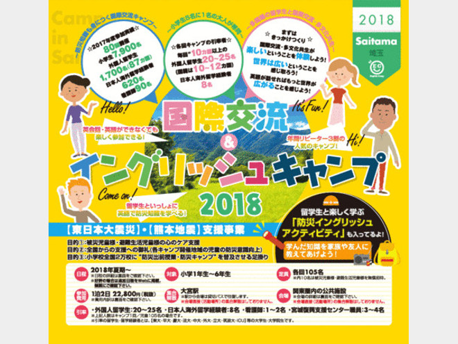 宮城復興支援センターは、こども防災協会と共催で、東日本大震災・熊本地震支援事業として、留学生と一緒に英語で防災知識を学べる「国際交流イングリッシュキャンプ2018」を開催する。出発エリアは埼玉、福岡、静岡、千葉、大阪、愛知、東京、神奈川、兵庫、京都。対象は小学1年から6年生で、外国人留学生、日本人海外留学経験者などが引率する。7月、8月の夏休み期間のほか、エリアによっては10月以降も開催される。