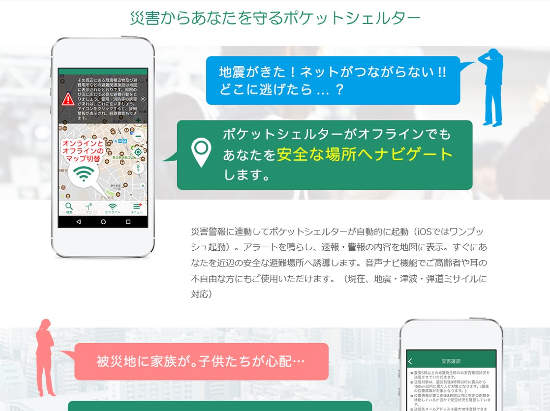ポケットシェルター株式会社は、「災害の通知」から「避難行動」、「安否確認」までをトータルサポートするオフラインナビアプリ「ポケットシェルター」を開発した。平時には豊富な観光情報を検索することができ、災害時には画面を切った状態でも警報と連動して自動的に防災モードに切り替わる。災害時に見舞われるオフライン状態でも使える機能を組み込んでおり、オフライン地図の表示、現在地の表示、周辺の避難所情報の音声・テキストによるお知らせなどが可能である。また、震源地付近にいた人の登録連絡先に対し、被災した可能性がある旨が第一報で届き、その後、移動が検知されたかどうかで、その人の安否確認情報が自動的に送信される機能も組み込まれている。なお、5月1日より完全無料化され、これらの機能がベーシック版として利用可能となっている。