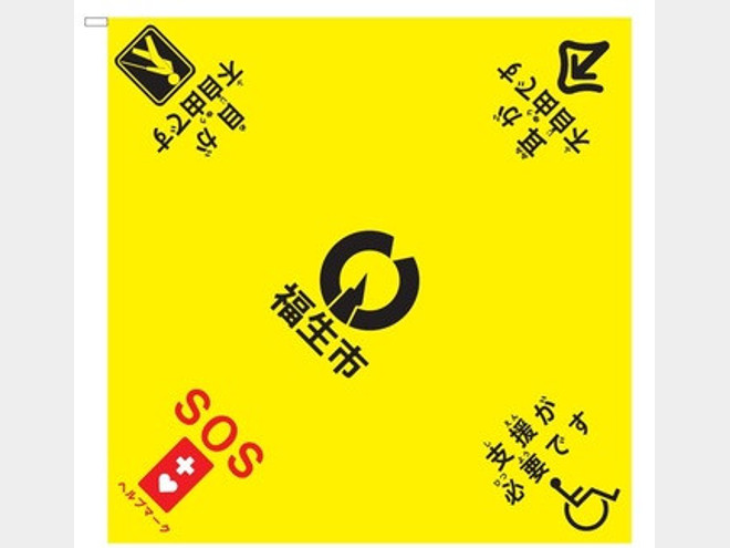 東京都福生市が、障害者が災害時等に要援護者となることを想定して、避難所等においてどのような援護が必要なのか一目でわかるように「ふっさ ヘルプバンダナ」を作成した。70センチ四方の目立つ黄色のバンダナで、四隅には異なる援護内容に対応した文字とマークを印字している。「目が不自由です」のメッセージは、手触りでも区別できるタグ付き。三角巾としても使える。