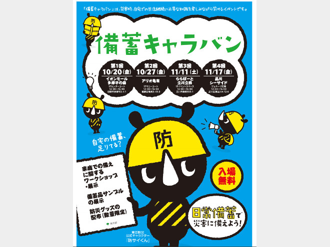 東京都で「都民の備蓄推進プロジェクト」の一環として、都内各地でイベントを開催する。「備蓄キャラバン」は10月20日(金)より都内4か所で開催。災害時、自宅での生活継続に必要な知識を楽しみながら学べる。「備蓄の日フェスタ」は11月19日(日)に新宿駅西口広場イベントコーナーで開催。ミニセミナーや家庭での備えに関するワークショップなどが行われる。