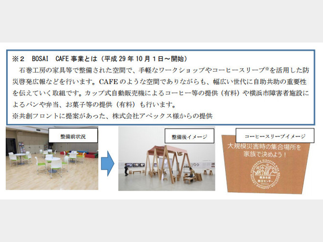 横浜市とクレジットカード会社「クレディセゾン」が防災や減災の意識を高めるため、協力して催しを開くことなどを柱とした連携協定を結んだ。10/1(日)には、東日本大震災を機に設立され、東北産の木材を使った製品で知られる宮城県石巻市の石巻工房のスタッフを招き、「家具製作ワークショップ」を開く。作業しながら防災を意識してもらい、完成後はセンターの待合スペースに設置し、防災マップ作りや救助方法を教える講座などを開く空間にする。また、クレディセゾンのポイントを市の防災事業に役立てる取り組みも同日より始め、集まった金額に応じて市が啓発イベントを企画する。