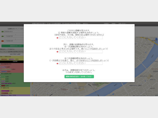 新潟大学の災害・復興科学研究所の井ノ口宗成助教授と大学院自然科学研究科電気情報工学専攻博士前期課程1年の関川貴大さんが、新潟市で津波が発生した際の避難経路を調べられる「避難計画作成支援ツール」を制作し、インターネット上で一般公開を始めた。ツールでは、自宅や会社などの「避難開始地点」、取り急ぎの避難場所となりそうな「一次避難目標」、海からより遠くて高い、最終的な避難場所としたい「二次避難目標」を入力すると、それぞれの避難目標までのルートと道のりの勾配、徒歩でかかる時間などが表示される。