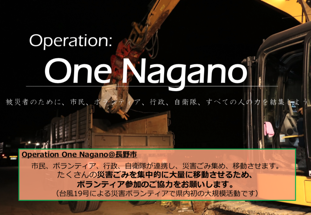 長野県では、 市民・ボランティア・行政・自衛隊などが連携し、被災者のために一丸となって災害廃棄物等の撤去を行う「One NAGANO(ワン ナガノ)」という全国のモデルとなり得るプロジェクトが立ち上がった。11月2日3日4日の3連休には、一層集中的に取り組むこととしている。