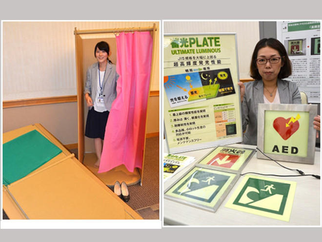 避難所での着替えに段ボール更衣室 防災グッズ、長時間発光する標識も