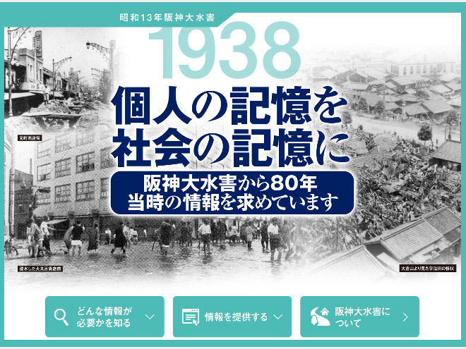 1938年7月3~5日に発生した阪神大水害から80年となるのを前に、関係自治体や有識者らでつくる実行委員会が、体験談や関連資料などの情報提供を求めている。集めた情報はインターネット上に「デジタルアーカイブ」として保存・公開する予定。完成後は、インターネットを通じて誰でも記録を閲覧でき、小中学校の地域学習等にも活用できるようにする。体験談や資料の募集は8月31日まで。問い合わせは実行委事務局へ。