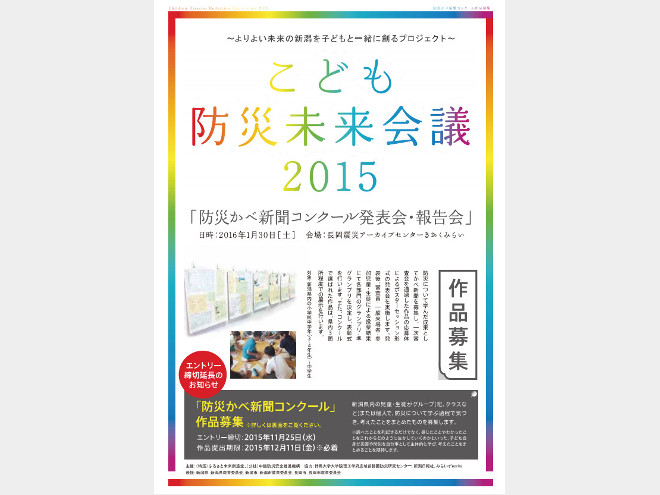 防災教育に取り組むNPO法人ふるさと未来創造堂などが、子どもたちが防災について学んだことを新聞としてまとめる「防災かべ新聞コンクール」の作品を募集している。過去の災害や防災などについて調べて感じたことや、将来どう生かすかを模造紙かB1判1枚にまとめる。対象は新潟県内の小学3年~中学生。小学生中学年、同高学年、中学生の3部門。クラスや班、個人で、所属する学校経由で11月25日までに申し込み、作品は12月11日までに提出する。