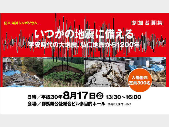 群馬県、群馬県建設技術センター、上毛新聞社の主催で、防災・減災シンポジウム「いつかの地震に備える~平安時代の大地震、弘仁地震から1200年~」を8/17(金)に前橋市の群馬県公社総合ビル多目的ホールで開催する。1200年前の弘仁9(818)年に関東地方全域に大被害をもたらした「弘仁地震」を題材に、熊本地震をはじめ頻繁に発生する内陸の大地震について学び、今後の防災対策を考える。