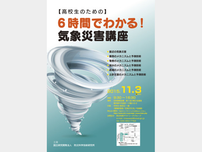 防災科学技術研究所が、防災力を身につけるための無料講座を11月3日に東京都千代田区・日本教育会館にて開催。防災科学技術研究所の研究員が講師となり、豪雨や竜巻、浸水や高波など土砂災害が発生するメカニズムや予測技術について1日かけて授業を行なう。参加対象は、高校生だけでなく、中学生や一般まで250人が定員で、事前の登録が必要(先着順)。